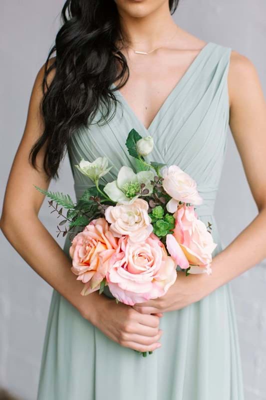 XXX The Cameron collection offers subtle but vibrant colors and textures using mauve and natural green succulents, salmon and apricot-colored Diana roses, airy white peonies, soft green tropical hellebores, and a hint of pale peach ranunculus and beautiful forest fern.